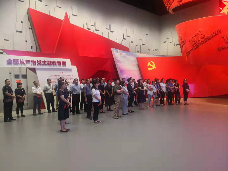 全面從嚴(yán)治黨主題教育展以習(xí)近平新時(shí)代中國(guó)特色社會(huì)主義思想為指導(dǎo),以黨的政治建設(shè)為統(tǒng)領(lǐng),以“全面從嚴(yán)治黨永遠(yuǎn)在路上”為主題。展陳分布在三層樓,集中展示黨的十八大以來(lái),以習(xí)近平同志為核心的黨中央以永遠(yuǎn)在路上的堅(jiān)韌和執(zhí)著推進(jìn)全面從嚴(yán)治黨取得的卓著成效。同志們跟隨講解員,依次參觀了序廳、政治立魂篇、嚴(yán)管立威篇、紀(jì)法立行篇、警示立戒篇、黨性立心篇、文化立信篇、互動(dòng)區(qū)和尾廳等九個(gè)部分的展覽。